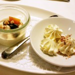 1. Gang: Gänseleberterrine und geräuchertes Forellenfilet in lauwarmer, geschäumter Milch von der Pastinake
