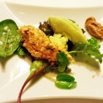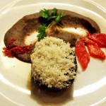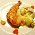 Die zweite Flasche Chablis präsentierte sich immer noch deutlich gereift, aber etwas frischer, sozusagen mit ‚Lachfalten‘. Die Aromen, die die Garnele begleiten, könnten den zarten Geschmack der Garnele erschlagen, tun sie aber nicht. Sie sind vornehm zurückhaltend eingesetzt, und deshalb integriert sich auch der gereifte Wein ganz ausgezeichnet.