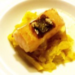 2. Gang: Gebratenes Rochenfilet auf süß-saurem Kürbisgemüse mit fritierten Kabern und heißer Mayonnaise