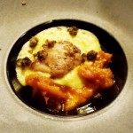 - Gebratenes Rochenfilet auf süß-saurem Kürbisgemüse mit fritierten Kapern und heißer Mayonnaise