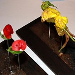 Appetithäppchen: Gelbe Tomate mit Nachtkerzenblüte und Amaranth,