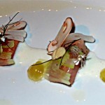 Das ist sicher kein klassisches süßes Dessert, auch wenn es auf den ersten Blick so aussieht. Das ‚Eis‘ ist eine Tomatencreme und was aussieht wie Apfel- oder Melonenstückchen ist grüne Tomate mit knusprigem Eisenkraut (Verbene) on top. Alles unaufdringlich gesüßt. Auch hier wieder ein Spannungsbogen von vegetabil-süßlich zur deutlichen Bitternote des Eisenkrauts.