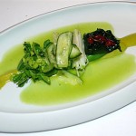 Erbsen und Erbsensprossen, eingelegte Dillblüten, Apfel und geschossener Lauch, wilder Spinat, Zwetschgen und Pistaziencreme. Eine Explosion von fruchtigen, nussigen und vegetabilen Aromen! Ungeheuer spannend und abwechslungsreich, mild und kräftig zugleich, je nachdem wo man die Gabel ansetzt. Wunderbar!