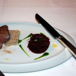 Das auf Wacholderasche gegrillte Rehmedaillon zählt zum Besten, was ich je aus Reh genossen habe. Der sehr feine Wildgeschmack des butterzarten Fleisches wird durch die Wacholdernote noch prägnanter. Das Zitronenchutney und die Schnittlauchcreme bilden einen sauren und herben Kontrast zum Fleisch und verschmelzen beim Kauen zu einer überraschenden Einheit. Die roten Beete mit Kirschen hätten auch alleine gut als eigener Gang bestehen können. Auch hier der Spannungsbogen zwischen fruchtiger und vegetabiler Note und dann die überraschende Verschmelzung von Fleisch, Frucht und Gemüse. Inspirierend!