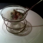 Da ich von einem anstrengend Arbeitstag schon etwas angeschlagen war, war mir ein Wein zu jedem Gang, also acht Gläser, zuviel. Zum Acht-Gänge-Menü habe ich insgesamt vier Weine genommen, also ein Kompromiss für jeweils zwei Gänge. Auf eine Bewertung der Kombination Wein/Speise habe ich deshalb bei einigen Gängen verzichtet.